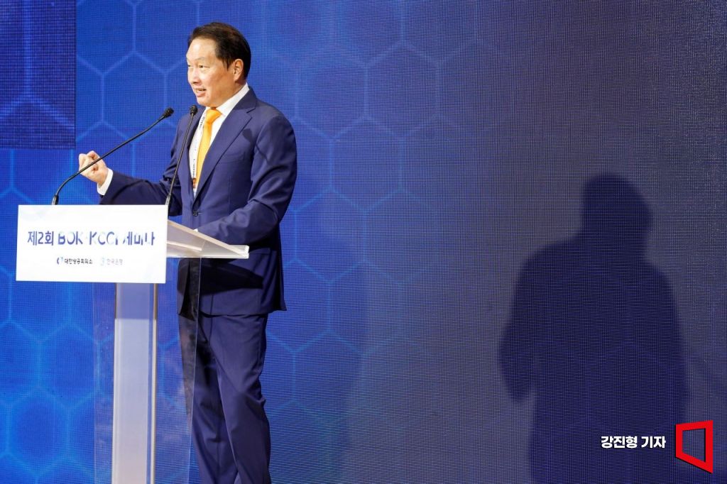 최태원 대한상공회의소 회장이 1일 서울 중구 한국은행에서 열린 '제2회 한국은행-대한상공회의소 세미나'에 참석해 인사말 하고 있다.