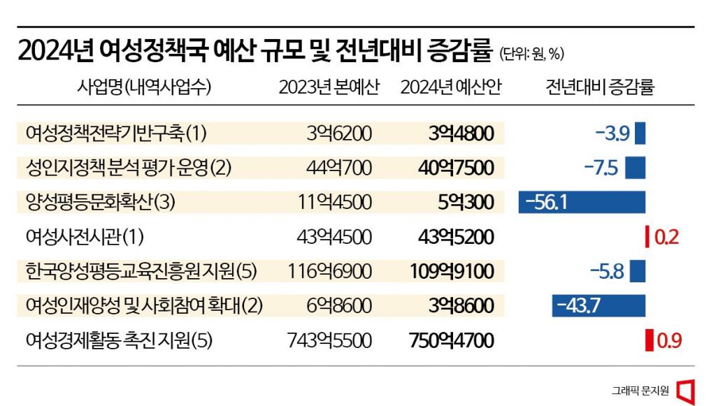 양이원영 더불어민주당 의원실이 2일 여성가족부로부터 제출받은 '여성정책국 2024년 예산안 전년 대비 증감액 세부내역'에 따르면 여성정책국에서 집행하는 사업(내역사업별) 19개 중 11개가 감액된 것으로 나타났다. 감액 대상 중 대부분은 양성평등 관련 사업(9개)에 해당한다. 또 권익보호 관련 사업(2개)도 감액됐다.