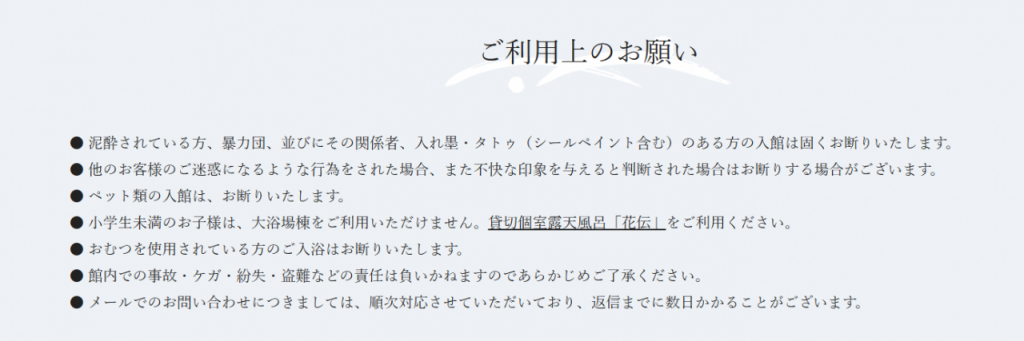 실제로 하코네, 유후인 등 유명 관광지에서는 심심찮게 '문신 있는 사람의 입욕을 금지한다'는 안내를 볼 수 있습니다.