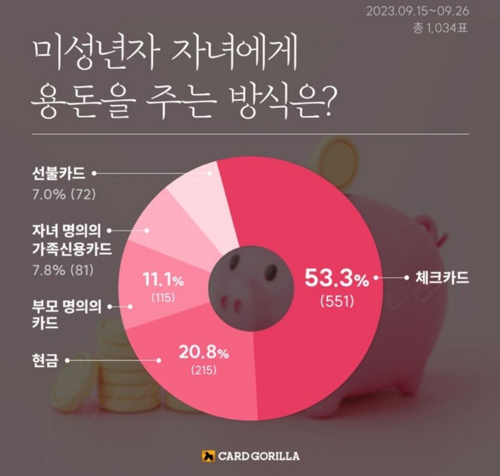 조사 결과, 응답자 중 절반 이상(53.3%, 551표)이 미성년자 자녀에게 '체크카드'로 용돈을 준다고 답해 가장 많은 응답을 차지했다. 2위는 '현금'(20.8%, 215표)이었고, 3위는 '부모 명의의 카드'(11.1%, 115표)였다. 2021년 혁신금융서비스로 지정된 '자녀 명의의 가족 신용카드'는 7.8%(81표), '선불카드'는 7.0%(72표)에 그쳤다.