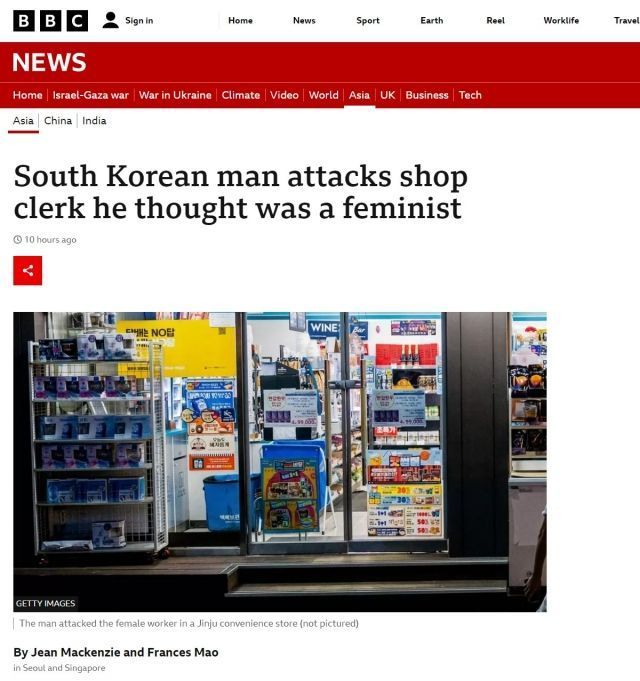 6일(현지시간) BBC는 '한국 남성이 편의점 직원을 페미니스트라고 생각해 폭행했다'는 제목의 보도를 내보냈다.
