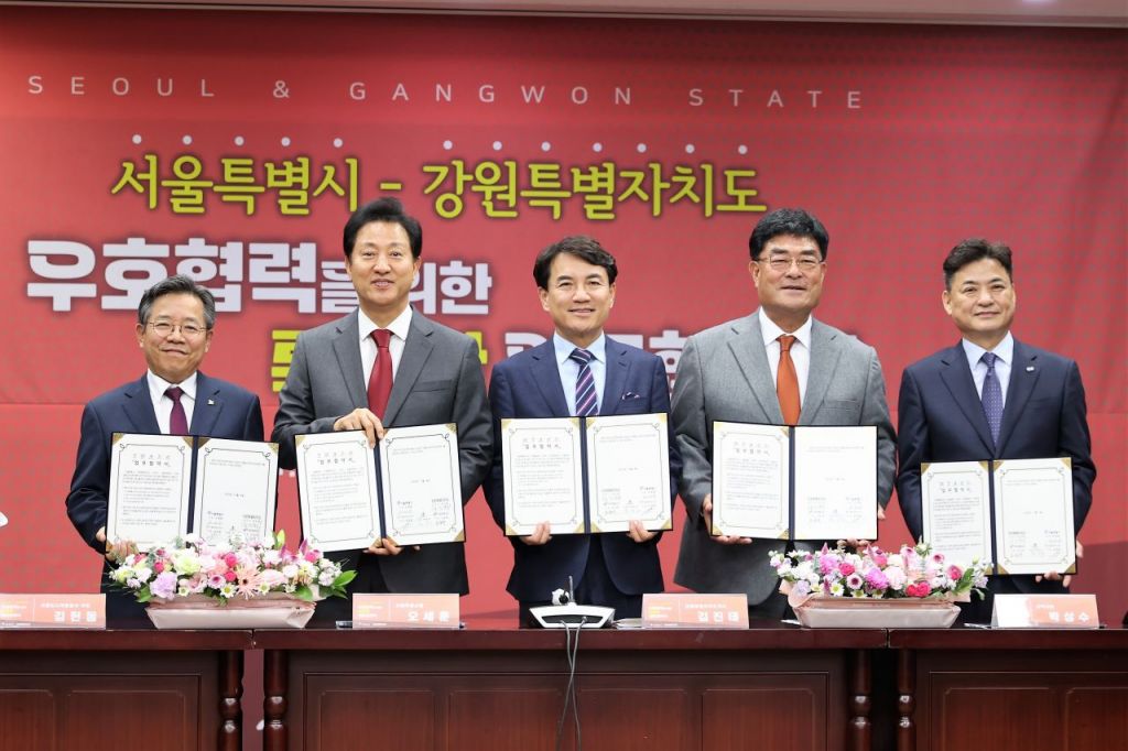 김헌동 SH공사 사장, 오세훈 서울시장, 김진태 강원도지사, 박상수 삼척시장, 오승재 강원개발공사 사장이 협약 체결 후 협약서를 들어보이고 있다.