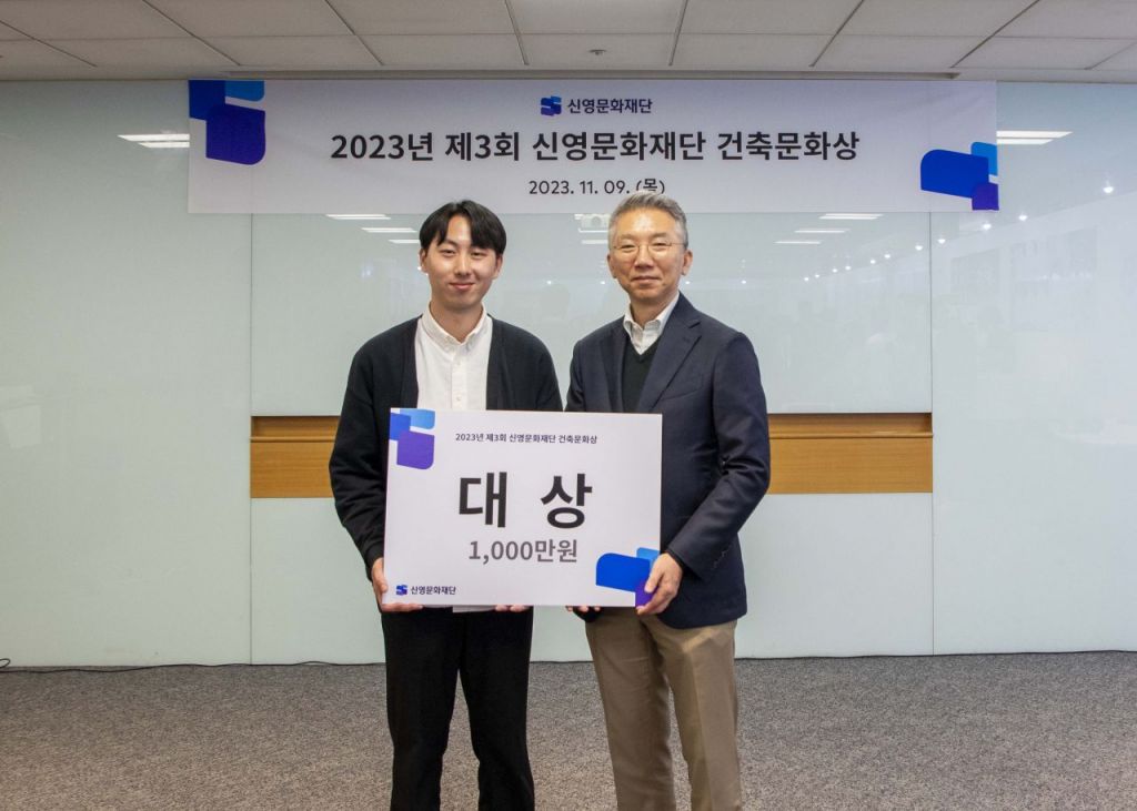 '제3회 신영문화재단 건축문화상' 대상 수상자 구예찬씨(왼쪽)와 김일권 신영문화재단 이사장이 지난 9일 서머셋팰리스 서울에서 열린 시상식에서 기념촬영을 하고 있다. / 사진제공=신영