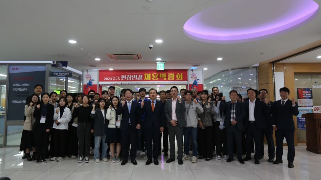 ‘2023 DSU 현장 연결 채용박람회’ 참가자들이 단체 기념사진을 찍고 있다.