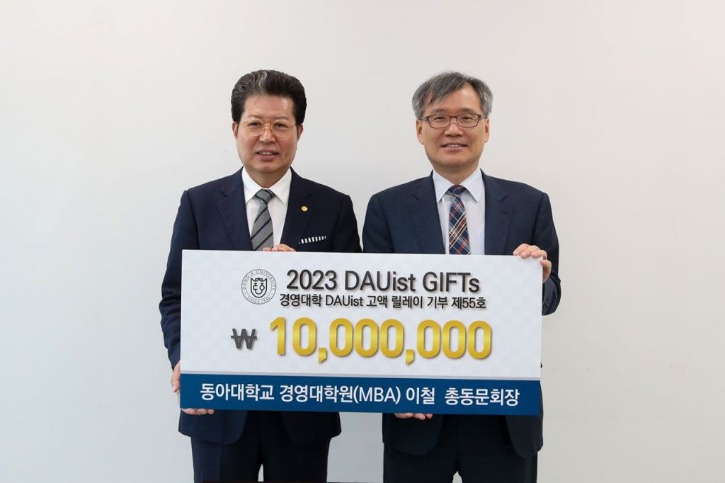 동아대학교 MBA 이철 총동문회장이 경영대학 발전과 교육혁신을 위한 다우이스트 기프트(DAUist Gift) 고액 릴레이 기부 제55호 주자로 1000만원을 기부했다.