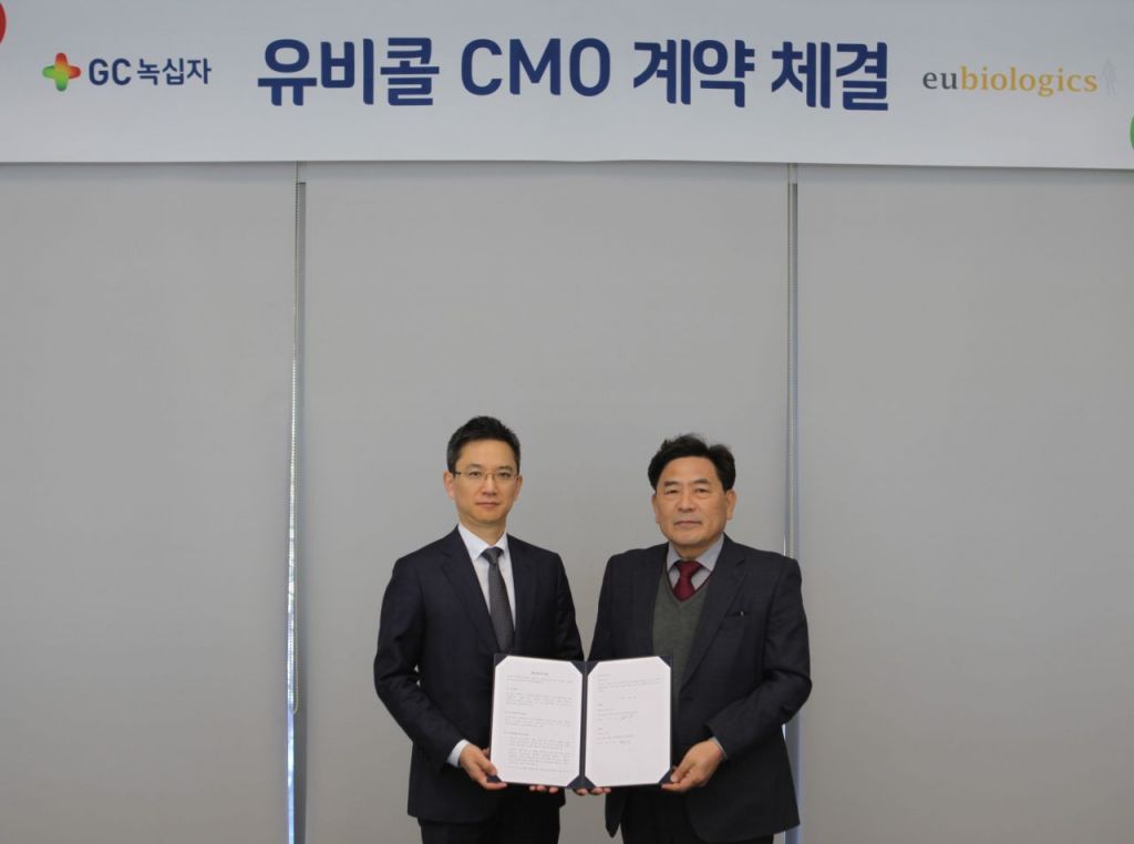 GC녹십자는 유바이오로직스와 콜레라 백신의 위탁생산 계약을 체결했다고 14일 밝혔다. 허은철 GC녹십자 대표(왼쪽)와 백영옥 유바이오로직스 대표가 계약 체결 후 기념촬영을 하고 있다. [사진제공=GC녹십자]