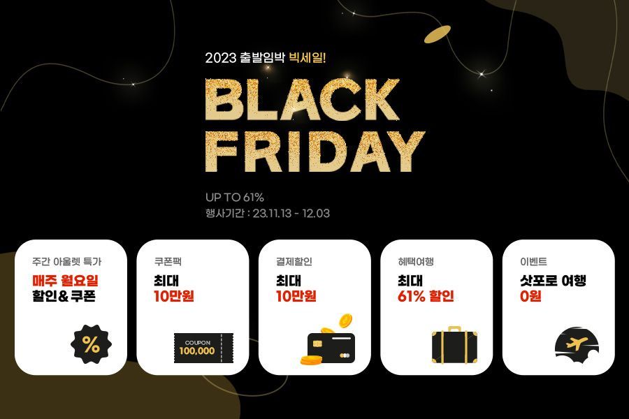 기획전을 통해 최대 61% 할인 특가상품, 매주 월요일 할인 혜택이 주어지는 주간 아울렛 특가, 최대 10만원 쿠폰팩과 결제할인 등 다양한 프로모션을 진행한다. 패키지 상품부터 에어텔, 항공권까지 각자의 취향에 맞는 상품을 보다 저렴하게 선택할 수 있다.