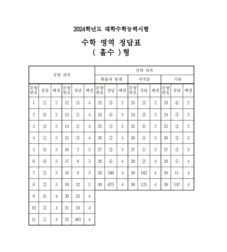 2024학년도 대학수학능력시험(수능) 수학 영역 홀·짝수 정답·답안지가 발표됐다.