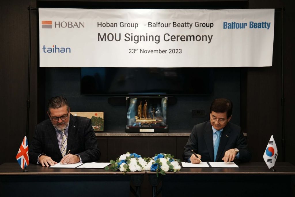 대한전선과 영국 발포어 비티가 송배전망 공동 참여 관련 MOU를 체결하고 있다. 오른쪽부터 김선규 호반그룹 회장, 크리스 존슨 발포어 비티 최고기술경영자(CTO).[사진제공=대한전선]