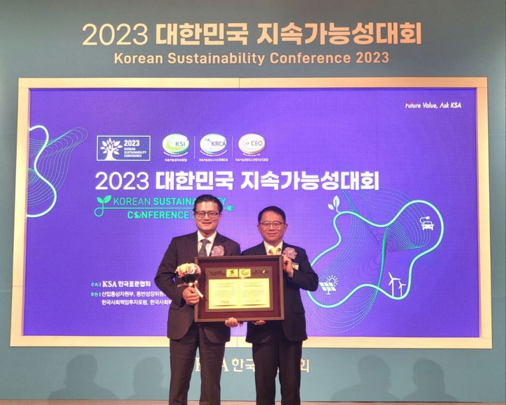 이현준 쌍용C&E 사장(왼쪽)이 ‘2023 대한민국 지속가능성대회’에서 강명수 한국표준협회 회장과 기념 촬영을 하고 있다. [사진 제공=쌍용C&E]