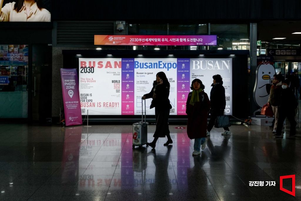 2030세계박람회 개최지 발표를 앞둔 24일 부산역에 유치 성공을 기원하는 홍보물이 설치돼 있다.