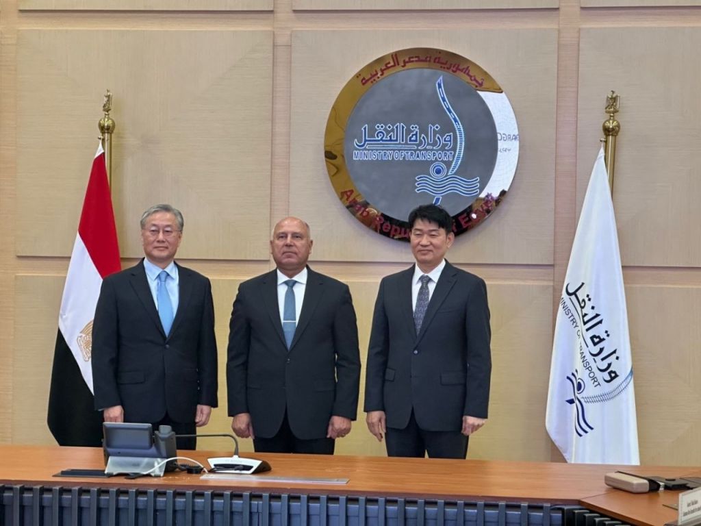 김용현 주이집트 한국대사(사진 왼쪽부터), 카멜 엘 와지르 이집트 교통부 장관, 박상준 STX 대표가 27일(현지시간) 협약식 후 기념촬영하고 있다.[사진제공:STX]