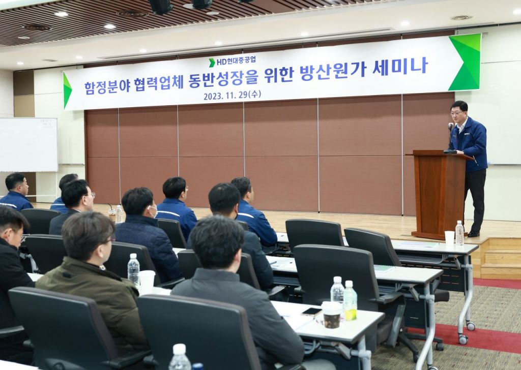 함정 방산 원가를 주제로 이번 세미나에서 HD현대중공업은 '함정 분야 협력회사 동반성장을 위한 발전방안'을 발표하고, 방산 원가 산출 시 협력회사들이 겪는 어려움을 들었다.