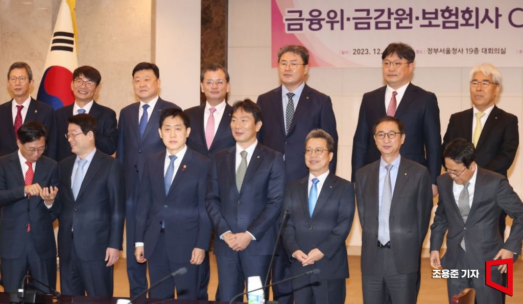 6일 서울 종로구 정부서울청사에서 열린 금융회, 금감원 보험업계 CEO간담회에서 김주현 금융위원장과 이복현 금감원장 등 보험업계 대표들이 기념촬영을 위해 자리를 잡고 있다. 이날 회의는 비공개로 진행됐다. 사진=조용준 기자 jun21@
