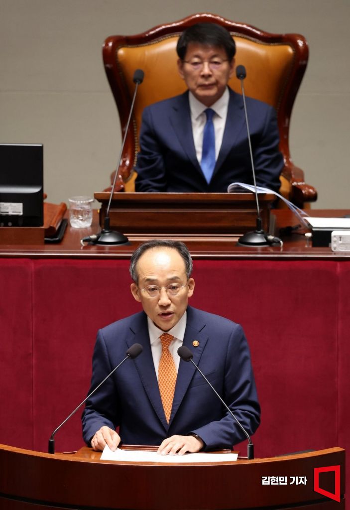 추경호 부총리 겸 기획재정부 장관이 3일 국회에서 열린 예산결산특별위원회 전체회의에서 내년도 예산안에 대한 제안설명을 하고 있다. 사진=김현민 기자 kimhyun81@