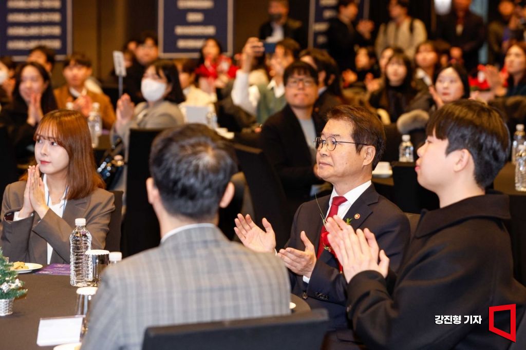 이정식 고용노동부 장관이 6일 서울 종로구 JW메리어트 동대문에서 열린 '2023 미래내일 일경험 콘퍼런스'에서 일경험 공모전 수상 청년들과 박수치고 있다.