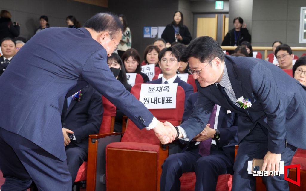 윤재옥 국민의힘 원내대표와 홍익표 더불어민주당 원내대표가 6일 국회 의원회관에서 열린 제5회 대한민국 동물복지대상에서 만나 인사하고 있다. 사진=김현민 기자 kimhyun81@