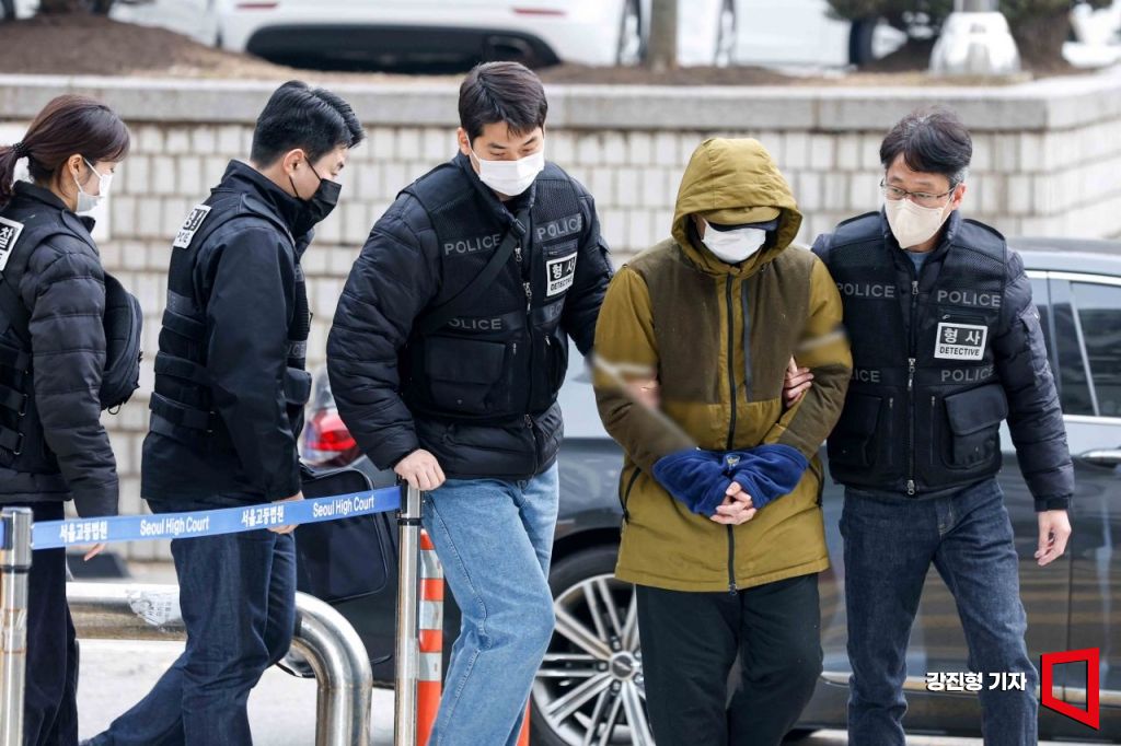 둔기로 아내를 살해한 대형 로펌 출신 한국인 미국 변호사가 6일 서울 서초구 서울중앙지방법원에서 열린 영장실질심사에 출석하고 있다.