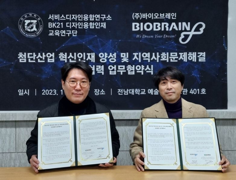 전남대학교 서비스디자인융합연구소가 ㈜바이오브레인과 11월 30일 업무협약을 맺고, 첨단산업 혁신인재 양성 및 지역사회 문제해결을 위해 상호 협력하기로 했다.