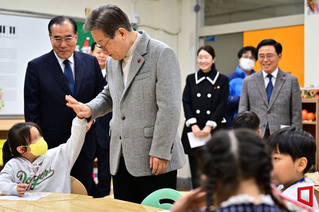 이재명 더불어민주당 대표가 6일 서울 강서구 방화초등학교에서 ’온동네 초등돌봄' 현장간담회에 참석하기 전 돌봄교실을 둘러보고 있다. 사진=국회사진기자단