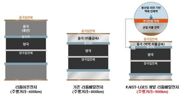 LG에너지솔루션과 한국과학기술원(KAIST)은 차세대 배터리인 '리튬메탈전지'로 1회 충전에 900㎞를 주행할 수 있는 기술 개발에 성공했다고 7일 밝혔다.
