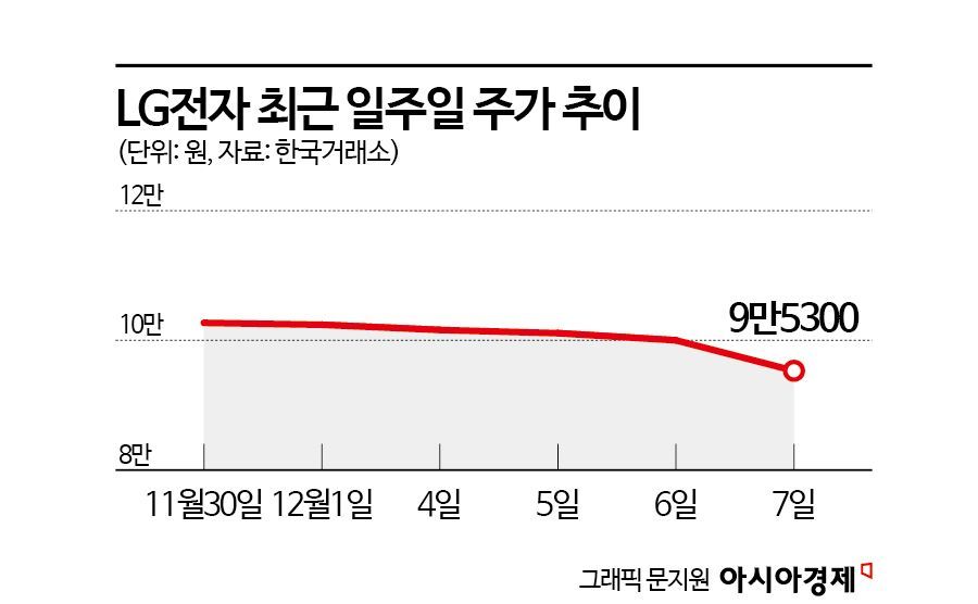 8일 한국거래소에 따르면 LG전자는 전일 4.7% 하락한 9만5300원에 마감하며 한 달여 만에 다시 10만원선이 무너졌다. 최근 7거래일 연속 하락세다. 이 기간 하락폭은 8.8%에 달했다.