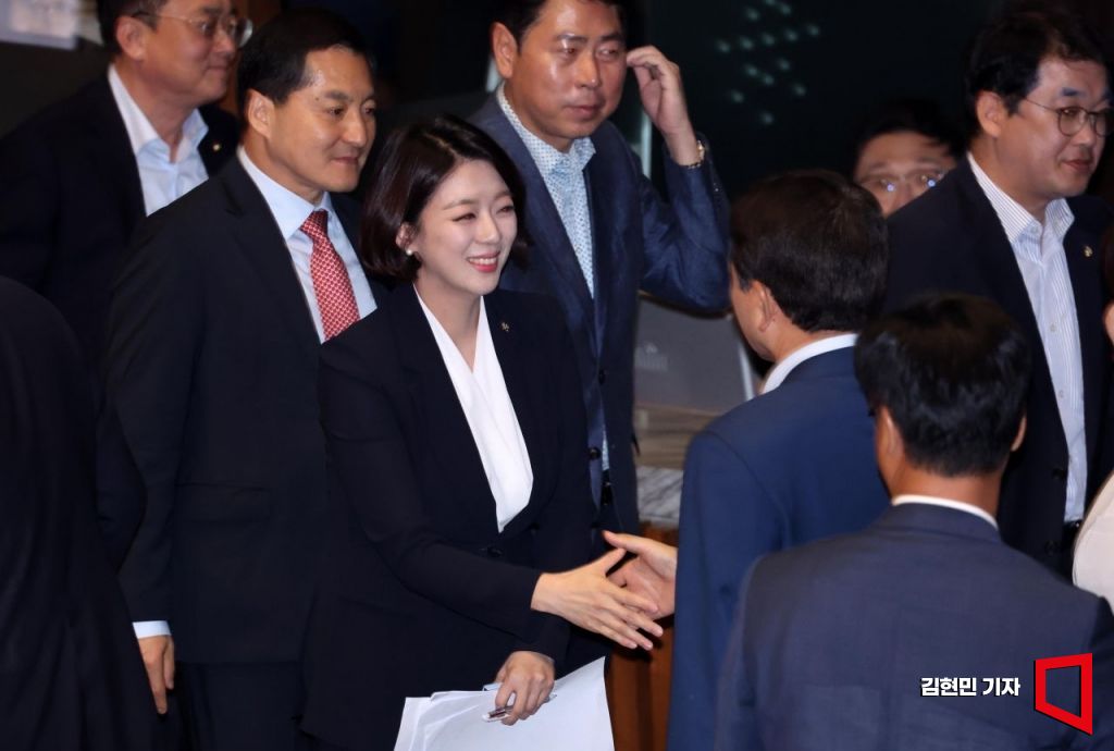 배현진 국민의힘 의원이 9월 8일 국회 본회의장에서 열린 교육·사회·문화 대정부질문에서 이동관 방통위원장에 대한 질의를 마친 뒤 동료 의원들의 격려를 받고 있다. 사진=김현민 기자 kimhyun81@