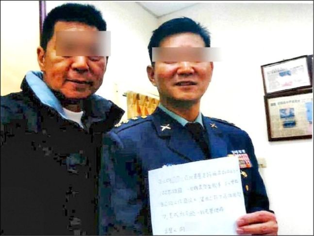 전쟁이 나면 중국에 투항하겠다는 서약서를 들고 사진을 찍은 대만 육군 장교 샹더언(오른쪽) [이미지 출처=대만 중앙통신사 보도 화면 캡처]