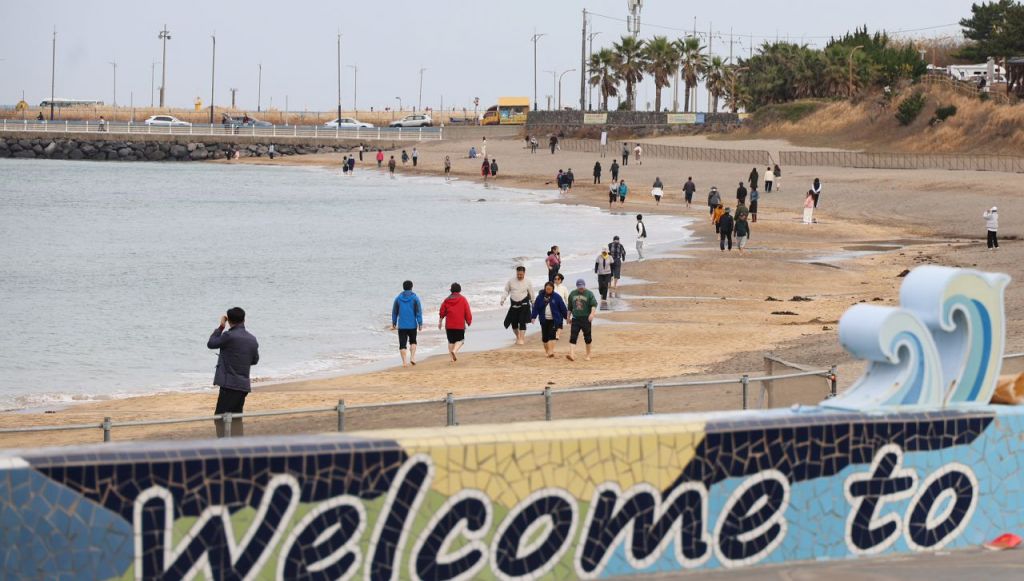 20도를 넘나드는 포근한 겨울 날씨가 이어지는 10일 제주 이호해수욕장에서 관광객과 도민 등 많은 사람이 바닷가 백사장을 맨발로 걷는 '어싱'(Earthing)을 즐기고 있다. 어싱은 맨발로 땅을 밟으며 지구와 몸을 하나로 연결한다는 의미다. [이미지출처=연합뉴스]