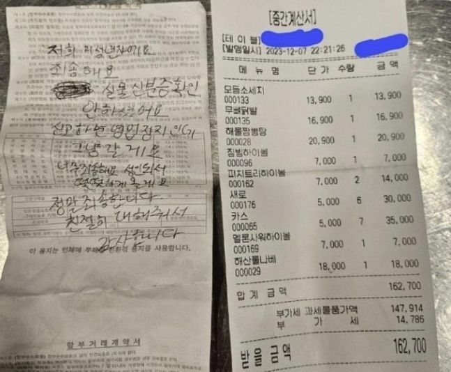 다른 영수증의 뒷면에는 "저희 미성년자예요. 신분증 확인 안 하셨어요. 신고하면 영업 정지인데 그냥 갈게요"라며 "너무 죄송해요. 성인 돼서 떳떳하게 올게요. 친절히 대해줘서 감사합니다"라는 글이 적혀있다.