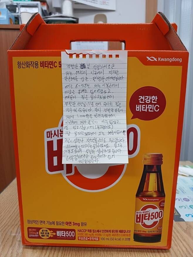 13일 부산 중구 보수파출소에 따르면 지난 8일 오후 7시 30분쯤 파출소에서 근무하던 한 경찰관이 파출소 앞에 놓인 건강 음료 2상자와 손편지를 발견했다.