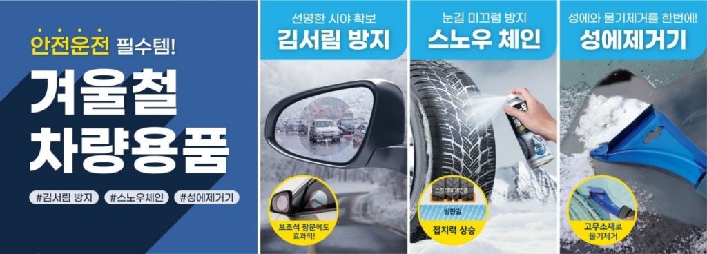 '스프레이 스노체인'은 스프레이 체인 층을 형성해 타이어 접지력을 높였다. 지속시간과 효과는 주행 환경에 따라 다르므로 안전하게 사용하는 것이 좋다. '차량용 와이퍼'는 다양한 사이즈로 준비돼 차량 규격에 맞게 사용하기 좋다.