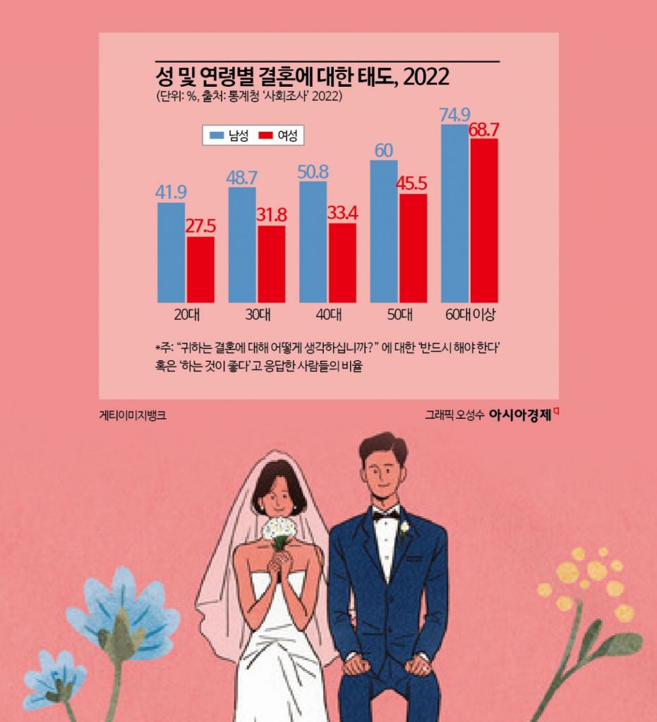 2008~2022년 사이 20대 남성은 30.0%포인트, 여성은 25.4%포인트 감소했다. 결혼에 대한 긍정적 태도는 남녀 모두 30대보다 20대의 감소 폭이 컸다. 특히 20대 여성 중 '결혼을 반드시 해야 한다', '하는 것이 좋다'는 태도는 27.5%에 불과한 것으로 나타났다. 지난해 결혼에 대한 긍정적 태도는 연령이 증가할수록 높고, 특히 60대 이상에서 남성 74.9%, 여성 68.7%로 50대(남 60.0%, 여 45.5%)보다 더 높았다.