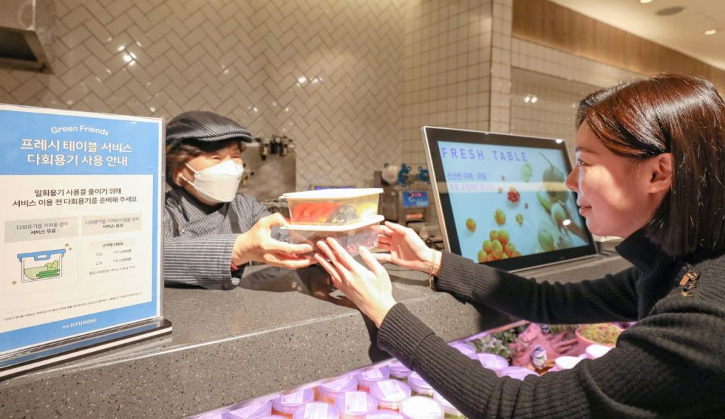 서울 강남구에 위치한 현대백화점 무역센터점 지하 1층 식품관 ‘프레시 테이블’에서 직원이 손님에게 다회용기에 담긴 상품을 전달하고 있다.[사진제공=현대백화점]