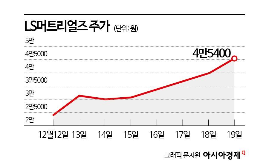 20일 한국거래소에 따르면 LS머트리얼즈는 상장한 지 6거래일 만에 공모가 대비 657% 상승했다. 공모가 6000원으로 상장한 첫날 2만4000원으로 거래를 마쳤다. 이튿날에도 상한가를 기록하면서 시가총액도 빠르게 커졌다. 전날에도 14% 가까이 오르면서 시가총액은 3조원을 돌파했다.