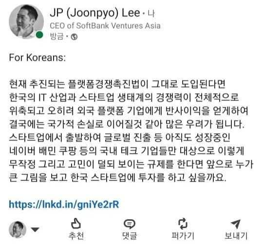 21일 이준표 소프트뱅크벤처스 대표는 링크드인에 "플랫폼경쟁촉진법이 그대로 도입되면 IT산업과 스타트업 생태계의 경쟁력이 전체적으로 위축되고 오히려 외국 플랫폼 기업에게 반사이익을 얻게 해 결국 국가적 손실로 이어질 것"이라며 "국내 테크 기업만 대상으로 규제를 하면 누가 큰 그림을 보고 한국 스타트업에 투자하겠냐"고 반문했다. 그러면서 "더 이상 혁신적인 스타트업인 네이버나 배달의 민족, 쿠팡 같은 기업을 한국에서 목격하기 어려워질 것"이라고 우려했다. 소프트뱅크벤처스는 당근마켓, 하이퍼커넥트, 네이버제트 등 한국 온라인 플랫폼 기업에 투자해 유니콘 신화를 만든 벤처캐피탈(VC)이다.