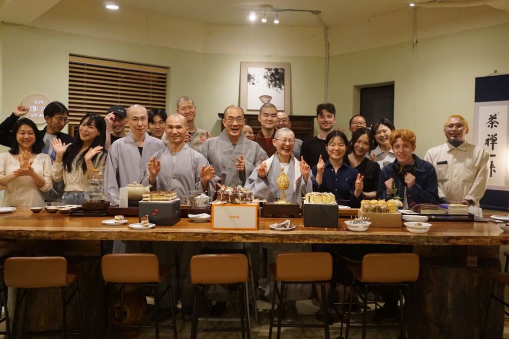 저스트비 홍대선원에서 준한스님(가운데 안경 쓴 남자)과 스태프, 방문객들이 생일파티하고 있다. [사진제공=저스트비 홍대선원]
