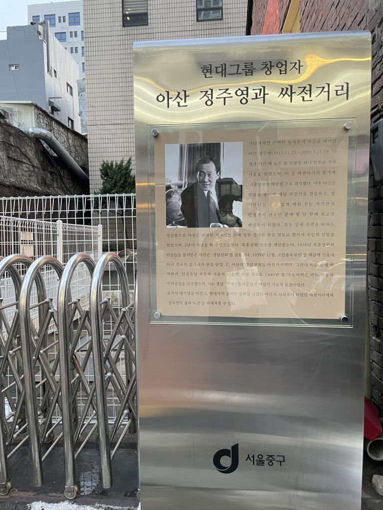 서울 중구(구청장 김길성)가 신중앙시장‘싸전 거리(퇴계로81길)’에 故 정주영 현대그룹 명예회장의 성공 스토리를 담은 조형물을 설치하고 역사문화 거리 조성에 나선다.