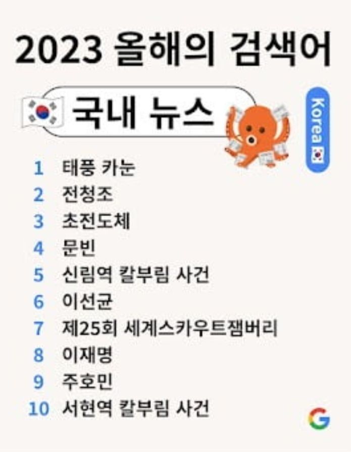 구글은 31일 '구글 올해의 검색어로 돌아보는 2023년' 자료를 발표했다. 이를 통해 본 올해 국내 뉴스 인기 검색어 1위는 지난 8월 한반도에 상륙한 제6호 태풍 카눈이었다. 카눈으로 인한 피해는 주로 남부지방에 집중됐지만 서울 종로구 한옥주택 지붕이 무너지고 인천에서도 침수와 외벽 붕괴 사고가 발생하는 등 수도권 지역까지 영향을 미쳤다. 중앙재난안전대책본부는 태풍 카눈으로 인한 피해액이 558억원에 달한다고 집계했다.