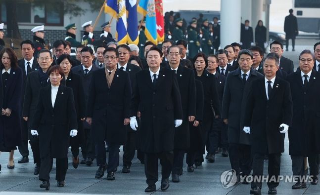 윤석열 대통령이 2024년 새해 첫날인 1일 서울 동작구 국립서울현충원에서 국무위원 및 참모진과 함께 현충탑으로 향하고 있다.[사진출처=연합뉴스]