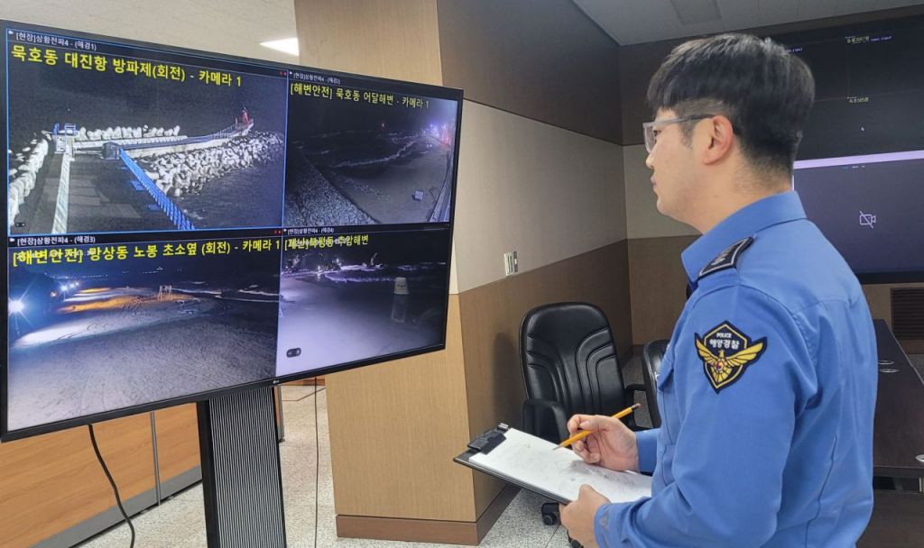 1일 오후 일본 도야마현 북쪽 해역에서 발생한 강진으로 인해 동해안에 지진해일이 닥쳐 해수면 상승 위험이 커지면서 동해해양경찰서 직원이 상황실에서 해안가 폐쇄회로(CC)TV를 살피고 있다. 2024.1.1 [이미지출처=연합뉴스]