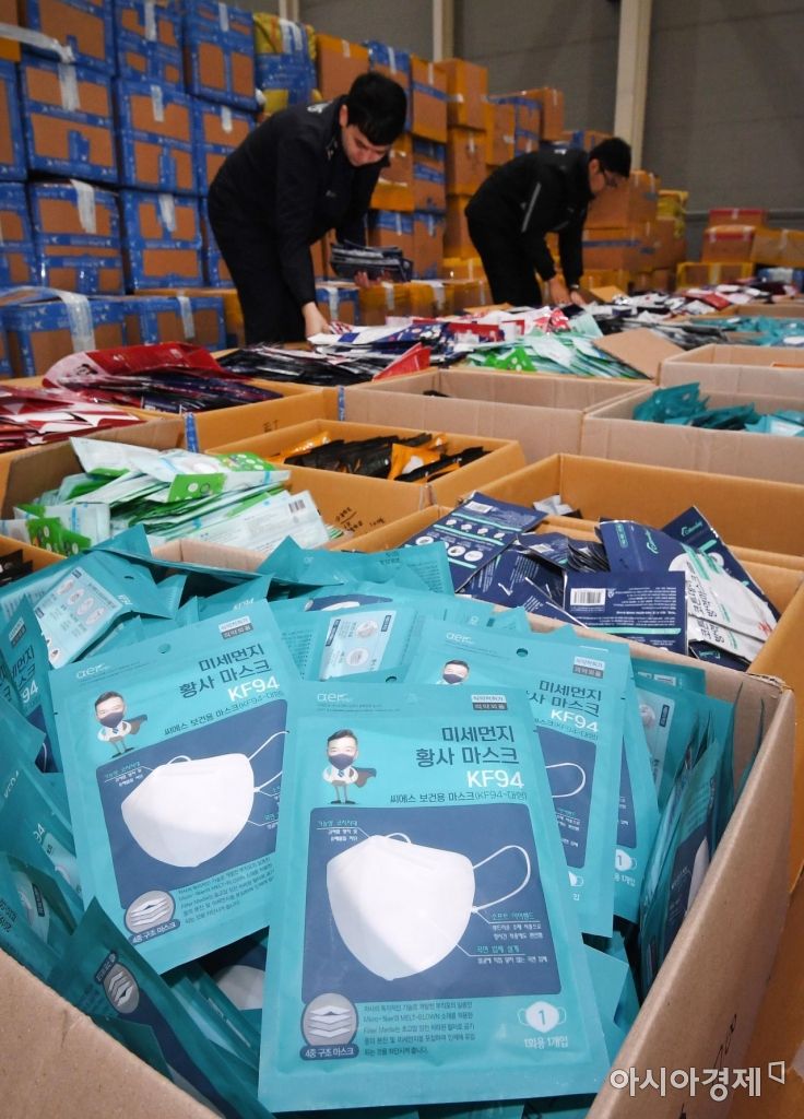 13일 인천 중구 영종도 인천공항수출입통관청사에서 세관 직원들이 코로나19 사태에 따른 밀수출 마스크 압수품을 공개하고 있다. 관세청은 코로나19 사태에 따른 마스크 불법 해외반출을 막기 위해 이달 6~12일 집중단속한 결과 72건, 73만장의 반출을 막았다고 밝혔다./영종도=김현민 기자 kimhyun81@