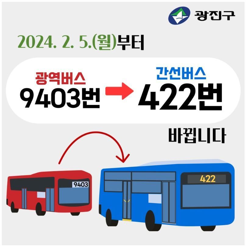 광진구(구청장 김경호)가 대중교통비 부담 완화를 위해 광역버스 9403번을 422번 간선버스 노선으로 개편했다.