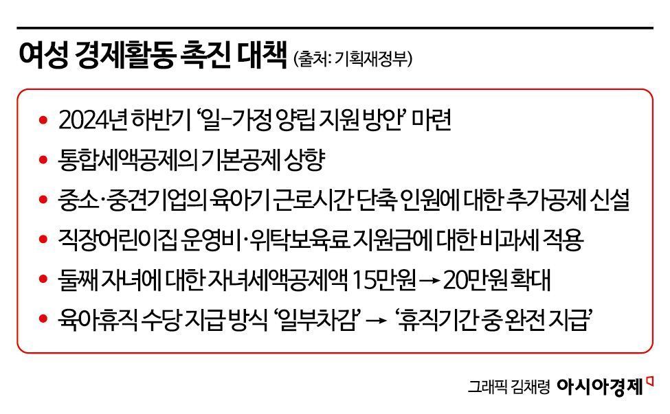 정부는 4일 이런 내용을 담은 '2024년 경제정책방향'을 부처 합동으로 발표했다. 정부는 경력단절여성 채용한 기업에 세금을 깎아주는 통합고용증대 세액공제의 기본공제를 상향해 세금을 더 깎아주기로 했다. 현재 경력 단절 여성을 채용한 기업은 청년, 장애인, 60세 이상 노인과 마찬가지로 고용 인원에 비례해 수도권 중소기업(1450만원), 지방 중소기업(1550만원), 중견기업(800만원), 대기업(400만원)의 기본공제를 적용받고 있는데, 해당 공제금액을 늘린다는 계획이다.
