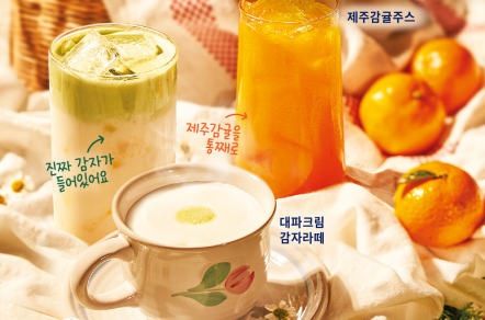 6일 유통업계에 따르면 더본코리아의 커피전문점 빽다방은 2024년 새해 첫 신메뉴로 우리 농산물을 활용한 대파크림감자라떼, 제주감귤주스를 출시했다. 대파크림감자라떼는 부드럽고 포실포실한 감자가 들어간 감자라떼 위에 연두 빛깔 대파크림을 올린 메뉴로, 색다른 맛의 조화를 자랑한다. 제주감귤주스는 감귤을 갈아 넣어 원물 본연의 맛과 향을 풍부하게 느낄 수 있다.