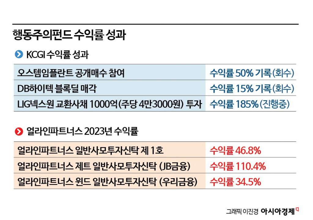 올 초 정기주주총회 시즌을 앞두고 행동주의펀드들의 주주행동과 수익률 성과가 재조명받고 있다. 그중에서도 누적 투자 규모가 1000억 원 이상인 얼라인파트너스와 KCGI 등의 수익률 성과가 눈길을 끈다.