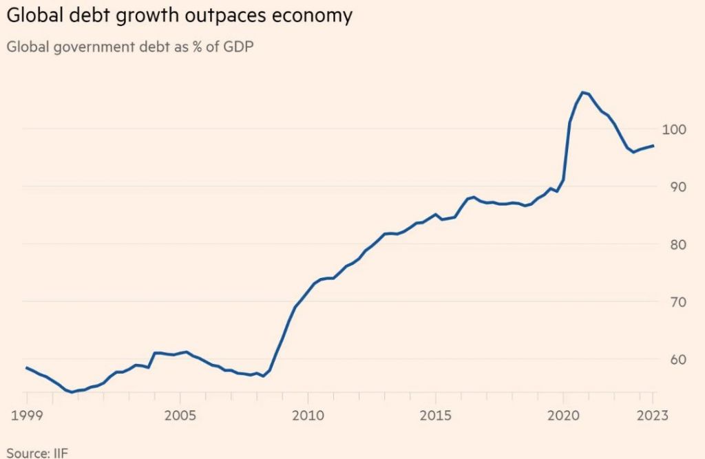 이에 따라 전 세계 GDP 대비 부채 비율은 2023년 초 334%에서 2023년 말 337% 이상으로 치솟았을 것으로 IIF는 보고 있다. IIF 추산에 따르면 전 세계 부채는 지난해 상반기 307조달러로 사상 최대치를 경신했다.