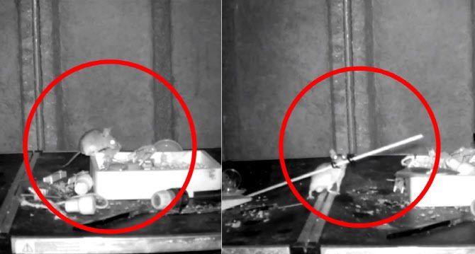 한번은 새들에게 주려고 꺼내 놓은 음식 부스러기가 헛간에 둔 낡은 신발 속에 옮겨져 있기도 했다. 결국 무슨 일인지 알아보기 위해 창고 작업대에 야간 투시 카메라를 설치한 그는 놀라운 장면을 확인했다. 작은 쥐 한 마리가 작업대에 놓여있는 물건들을 상자 안에 넣어 정리한 것이다.