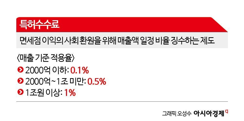 특허수수료는 면세점 이익의 사회 환원을 위해 매출액 일정 비율을 징수하는 제도다. 2017년 관세법 개정에 따라 전국 면세점은 매년 연간 매출액에 따라 최대 1%의 특허수수료를 내도록 했다. 수수료율은 매출 규모에 따라 달리 적용한다. 연 매출 2000억원 이하 면세점은 0.1%를, 2000억~1조원 미만은 0.5%, 1조원 이상은 1%의 수수료율을 각각 적용한다. 중견·중소 기업이 운영하는 면세점은 0.01%다. 전년도 매출액을 기준으로 부과된 수수료율에 따라 면세점들은 적용받은 수수료를 매년 4월에 납부한다.