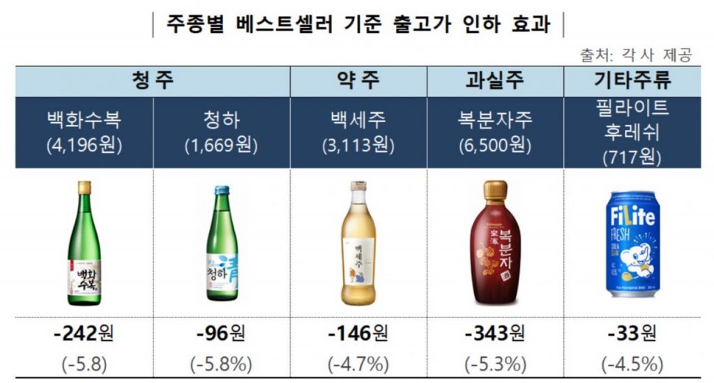 청주와 약주 등 국산 발효주는 기준판매비율 적용으로 다음 달부터 공장 출고가격이 5.8%까지 내려간다. 현재 출고가격이 4196원인 백화수복(700㎖) 의 경우 3954원으로 242원(5.8%) 낮아진다. 청하 1병은 1669원에서 1573원으로 공장 출고가가 96원(5.8%) 인하된다. 기타주류로 분류되는 필라이트후레쉬 1캔은 717원에서 684원으로 33원(4.5%) 인하된다.
